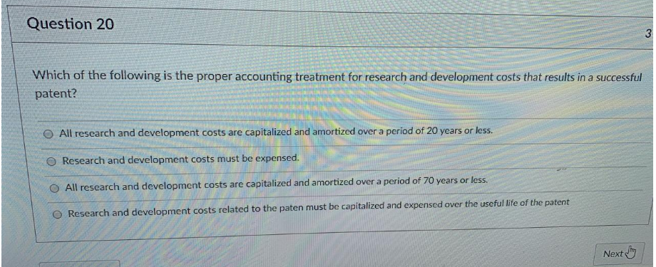 A patent must be shown as a current asset on the balance sheet. A Purchased Patent Must Be Expensed A Purchased Patent Must Be Capitalized And Expensed Each Year To The Extent That The Value Has Declined A Purchased Patent Must Be Capitalized And Amortized Over 20 Years Or Less. Which of the following is the correct accounting treatment for a patent.