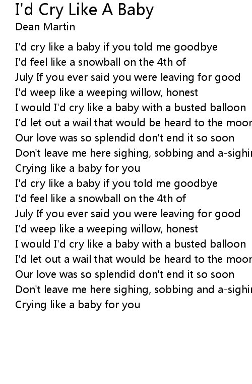 Cry like a baby lyrics. The song reached 2 in April 1968 on the Billboard Hot 100 chart a position it held for two weeksIt was kept out of the top spot by Bobby Goldsboros Honey which stayed at 1 for five weeksCry Like a Baby also reached 2 on Cashbox for one week. I cry like a baby. I cry like a baby Well I know now that youre not a play thing Not a toy or a puppet on a string As I look back on a love so sweet now I cry like a baby Every road is a lonely street I cry like a baby I know now that youre not a play thing Not a toy or a puppet on a string Today we passed on the street And you just walked on by My heart just fell to my feet And once again I began to cry When.